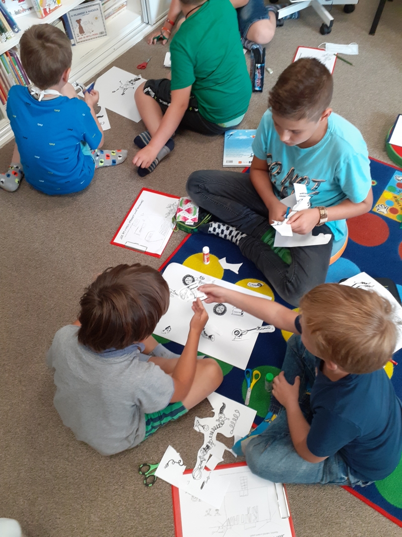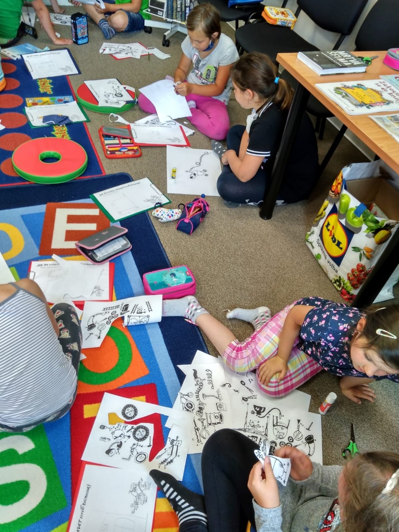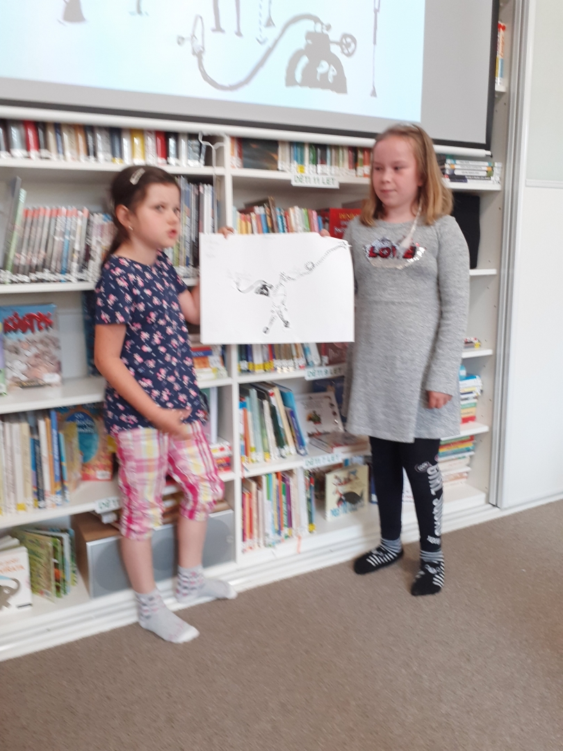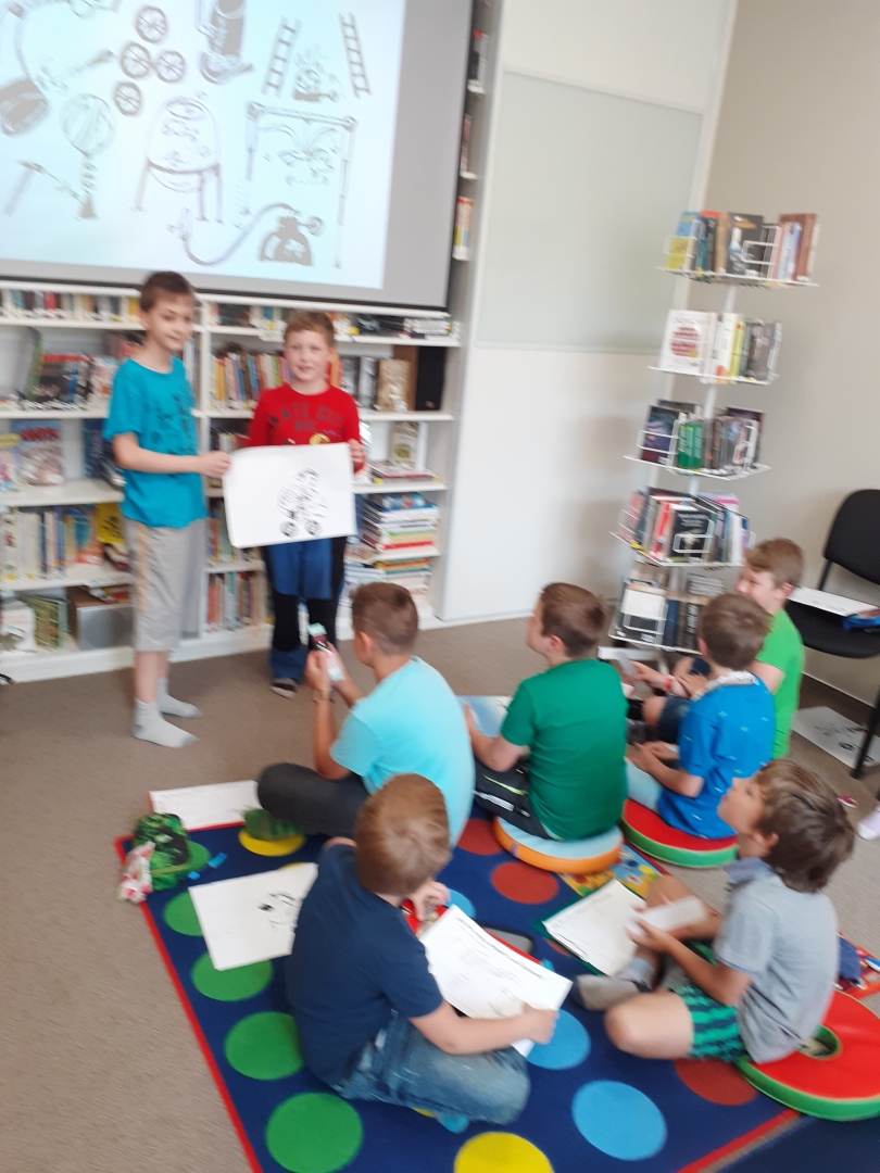 V praktické části děti nakreslily, jak by mohla vypadat nová knihovna, poté ve skupinkách vyrobily svůj vlastní vynález. Vynalezly různé stroje s mnoha funkcemi (uklízení, zalévání, hlídání, aj.) a různým pohonem (jeden byl na biomasu, další na kliku, jiný na solární pohon nebo třeba na foukání). Byly to prostě super stroje.