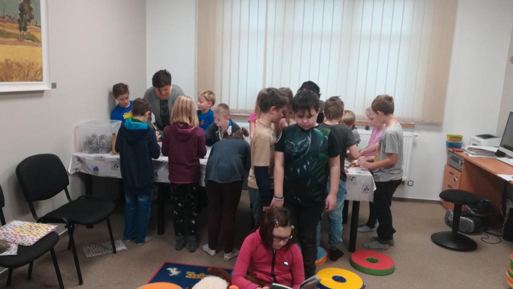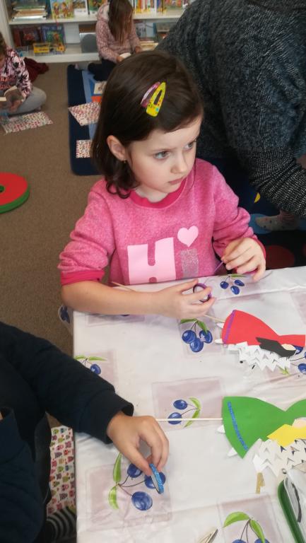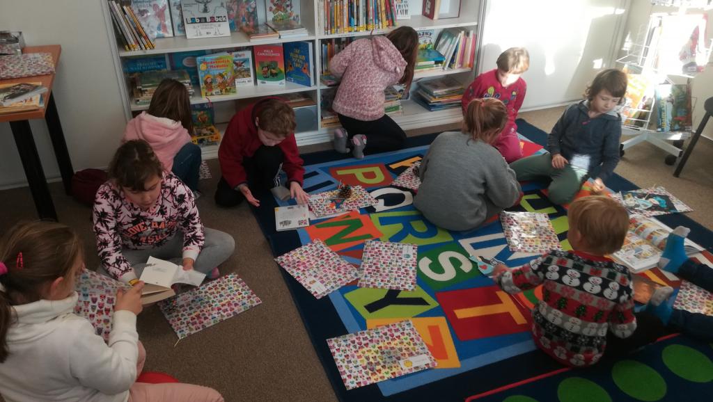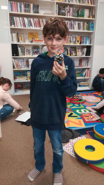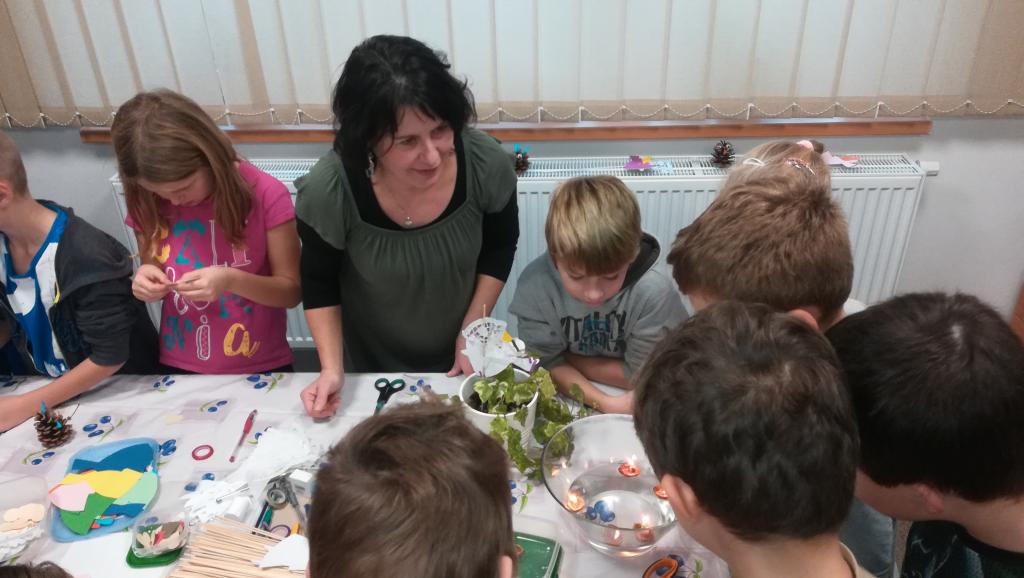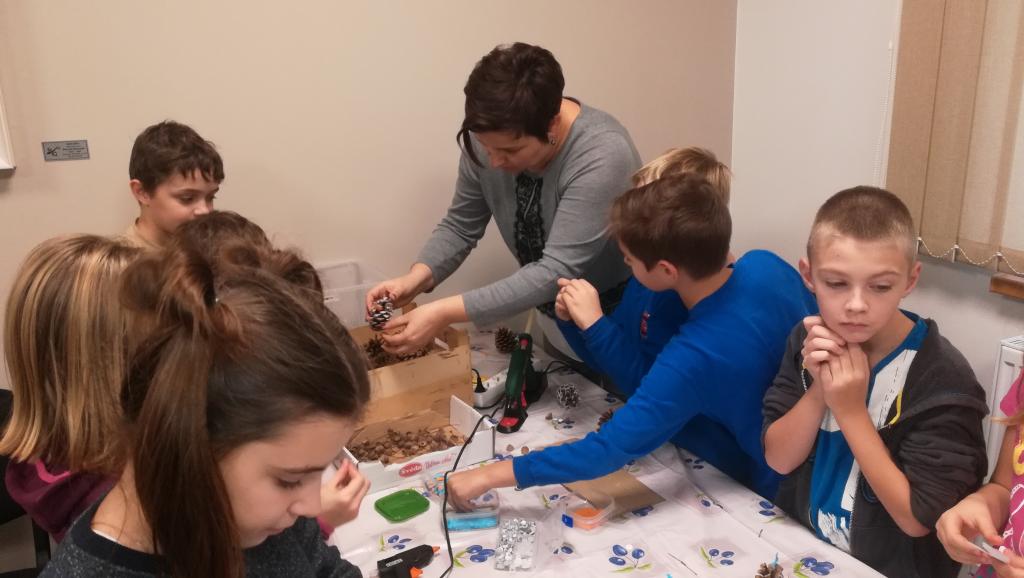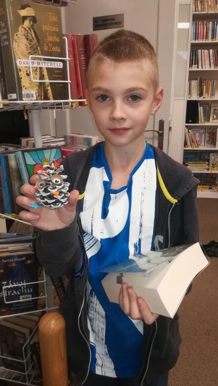Povídání a čtení o Vánocích u nás a v cizích zemích. Ukázka knih s vánoční tematikou. Tvoření Frikulína ze šišky a papírového anděla.