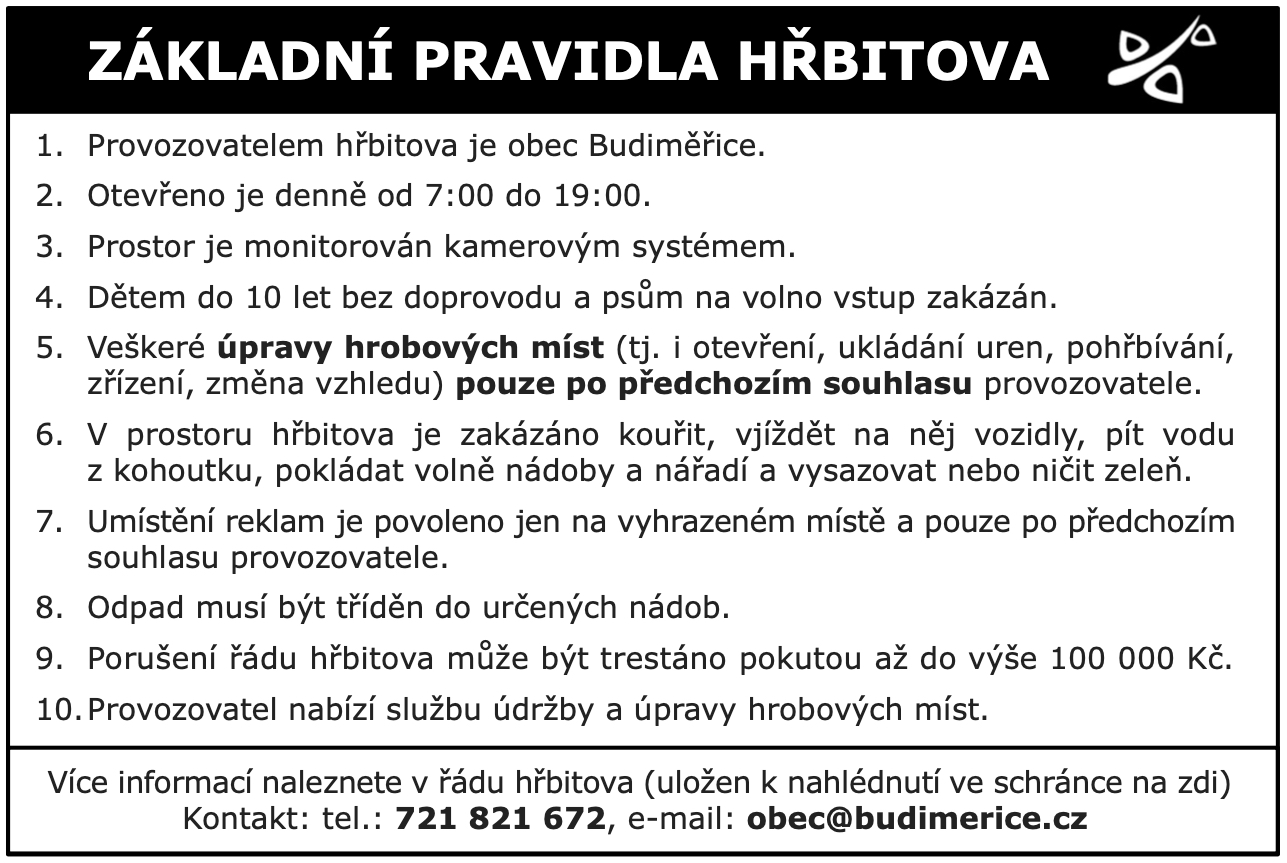 V nedávných dnech si návštěvníci hřbitova mohli všimnout nově instalované informační cedule nad kohoutkem s vodou, která upozorňuje na základní pravidla a povinnosti vyplývající z platícího Řádu pohřebiště. Řád jako takový je poměrně obsáhlý dokument, a proto jsme na ty nejdůležitější věci upozornili tímto způsobem. Prosíme seznamte se alespoň se základními pravidly. Zřejmě to nejdůležitější, které může nájemců hrobových míst ušetřit mnoho nepříjemností, je povinnost získat souhlas obce k veškerým manipulacím s hroby. Ať již jde o zhotovení nových hrobů, opravy stávajících, výsadbu nebo naopak likvidaci zeleně, vysypávání okolí hrobu štěrkem atd. Povolení obce je nutné mít i k ukládání uren nebo rakví.