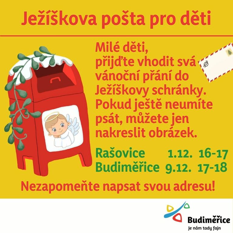 Svůj dopis pro Ježíška můžete vhodit do andělské schránky v neděli 1. 12. v Rašovicích při rozsvícení stromečku nebo v pondělí 9.12. u kostela v Budiměřicích při tradičním vánočním programu dětí ze základní školy.