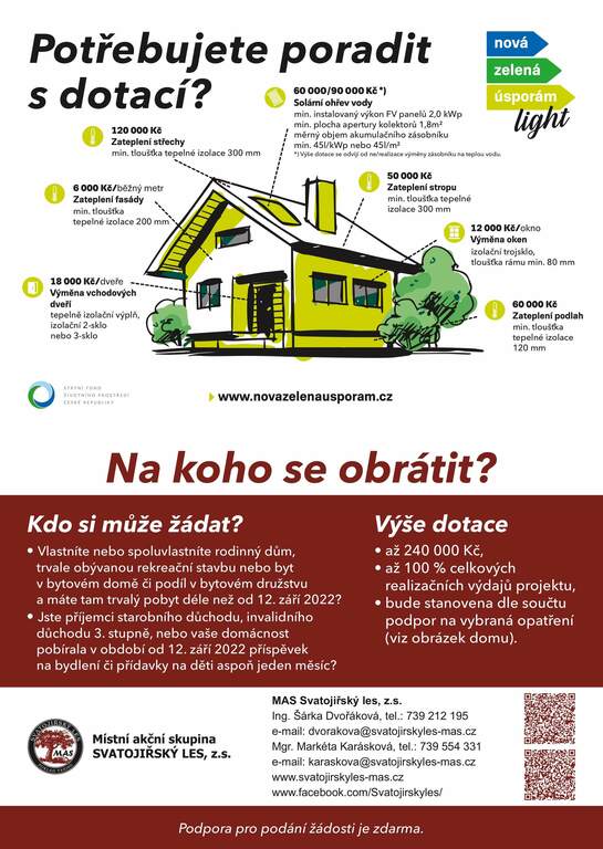 Potřebujete poradit s dotací na zateplení střechy, fasády, podlah a stropu; výměnu oken a vchodových dveří; solární ohřev vody? Podpora od pracovníků MAS Svatojiřský les, z.s. je zdarma.