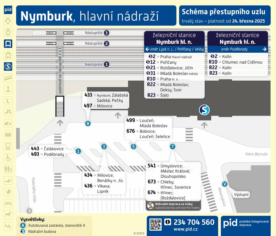 Na obrázku níže je schéma přestupního uzlu, ze kterého je patrné, odkud jaká linka nově odjíždí.