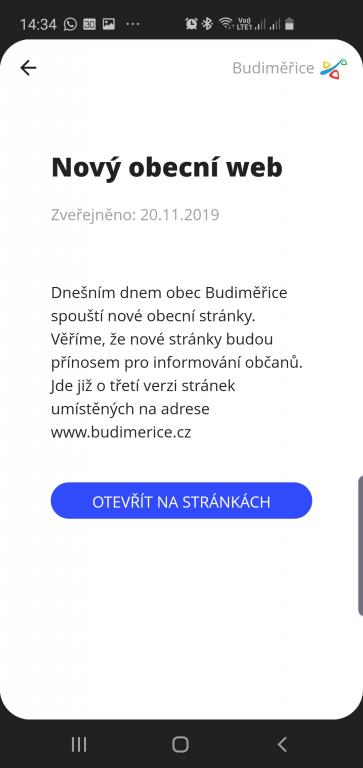Se zavedením nových webových stránek obce přichází zásadní změna v elektronické komunikaci směrem k občanům. Obec v nejbližších dnech ukončí zasílání hromadných emailů upozorňující na články, události a dokumenty vyvěšené na úřední desce. Emaily nahrazujeme mobilní aplikací pro vaše chytré telefony. V okamžiku, kdy je na internetových stránkách zveřejněn nový článek, událost nebo je vyvěšen dokument, informace je okamžitě přenesena do vašeho telefonu. Ten vás na takovou událost upozorní notifikací. V telefonu uvidíte stručnou upoutávku na aktualitu (tzv. perex), a pokud vás zaujme, tak si jí proklikem zobrazíte přímo na webu v plném znění. V případě událostí potom aplikace nabízí vychytávku v podobě možnosti přidání do kalendáře ve vašem telefonu.