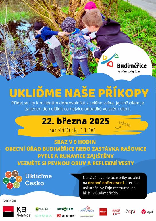 V sobotu 22. března 2025 od 9 do 11 hodin. Sraz dobrovolníků je před obecním úřadem v Budiměřicích nebo na zastávce v Rašovicích. Rukavice a pytle na odpadky jsou zajištěny. Vezměte si pevnou obuv a reflexní vestu.