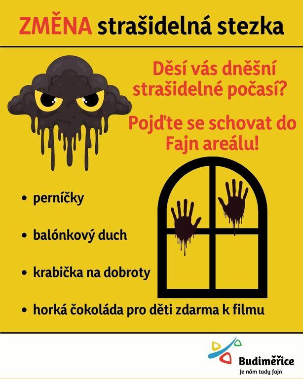 Vzhledem k aktuálnímu dešti a nepříznivé předpovědi na odpoledne se ruší venkovní část strašidelné stezky. Od 15:00 zveme děti na tematické tvoření ve Fajn klubíku a od 17:00 promítání filmu Hotel Transylvánie (2012), k filmu pro děti horká čokoláda zdarma.
