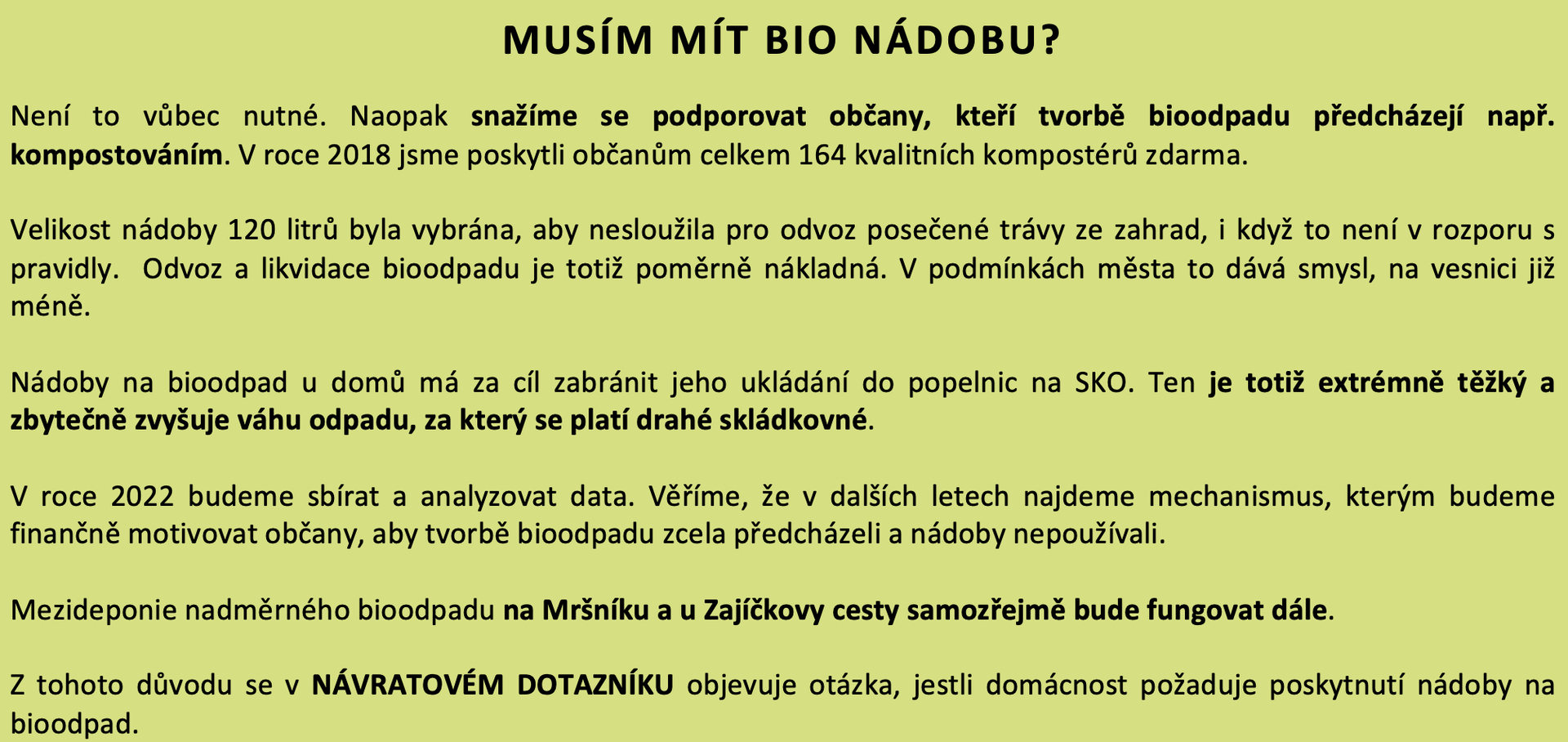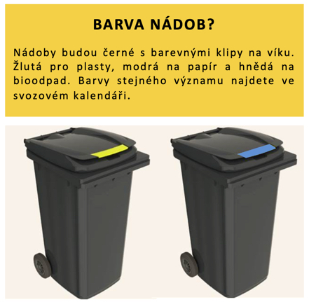 Podrobné informace o změně najdete v informační bulletinu, který se vám jednak dostanete do schránek, ale můžete ho najít i v příloze této aktuality. Určitě doporučuji si najít trochu času na seznámení s informačním materiálem. Zároveň máte možnost on-line vyplnit dotazník (ZDE) namísto papírové podoby. Bez vyplnění návratového dotazníku (on-line nebo papírově) vám nebudou nové nádoby doručeny.