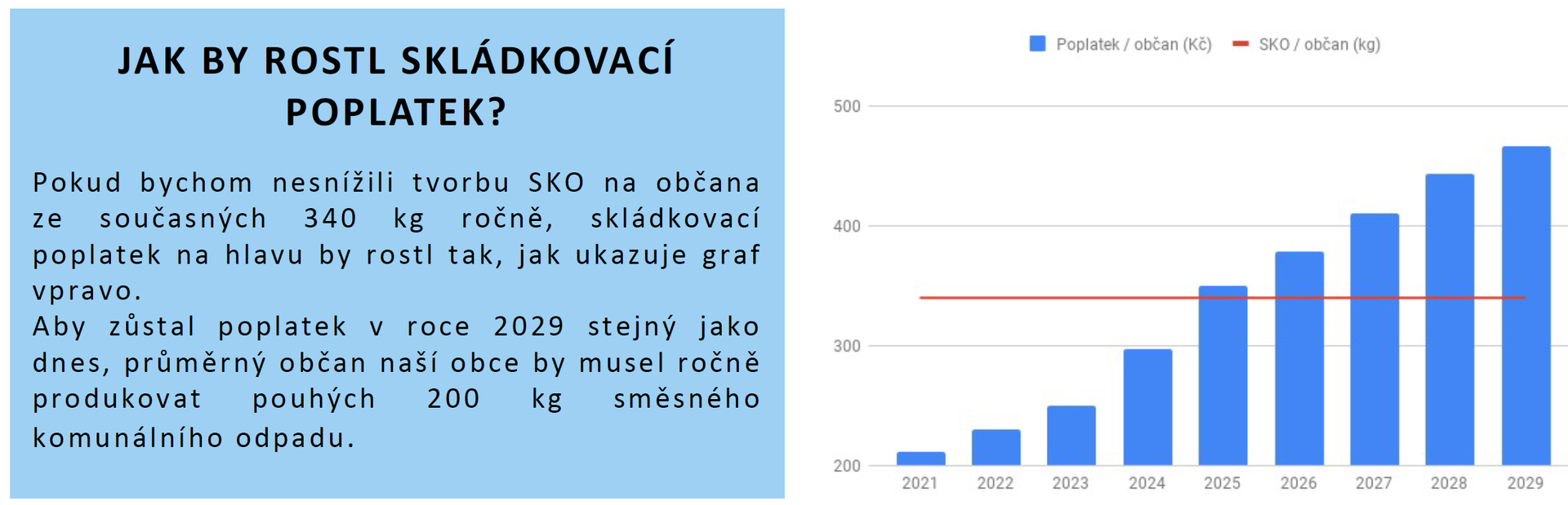 Za vším stojí snaha o snížení množství vytvářeného směsného komunálního odpadu (zkratka SKO) – výraz používaný pro nevytříděný odpad, který končí v klasických popelnicích u domů občanů a pak je odvážen na skládku. Stát se rozhodl na to jít přes naše peněženky. Konkrétně zvyšováním poplatku za uložení odpadu na skládku. Jde sice pouze o část nákladů na likvidaci odpadu, ale v příštích letech se bude raketově zvyšovat. Tento poplatek dnes vychází v případě Budiměřic na zhruba 210,- Kč/obyvatel. Způsob výpočtu zvýšení je složitý, ale platí, že pokud bychom nesnížili množství odpadu na jednoho občana, tak v roce 2029 bude poplatek 470,- Kč/obyvatel. Tzn. že pouze díky poplatku by cena pro 4 člennou domácnost narostla o 1.040,- Kč! Znovu upozorňuji, jde jen poplatek placený státu. Neobsahuje náklady na svoz a uložení na skládku. U těchto nákladů se očekává také budoucí růst.