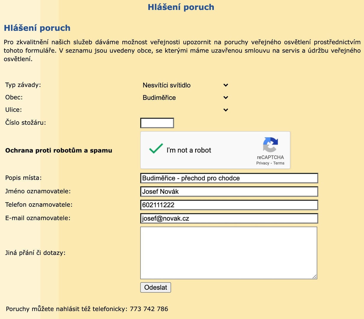 Protože zatím nemáme očíslovaná světelná místa (tento projekt připravujeme), tak je nutné do popisu místa co nejlépe uvést, kde se světlo v poruše nachází. Zcela jistě napsat část obce (Budiměřice, Rašovice, Šlotava) a pak např. nejbližší číslo popisné.